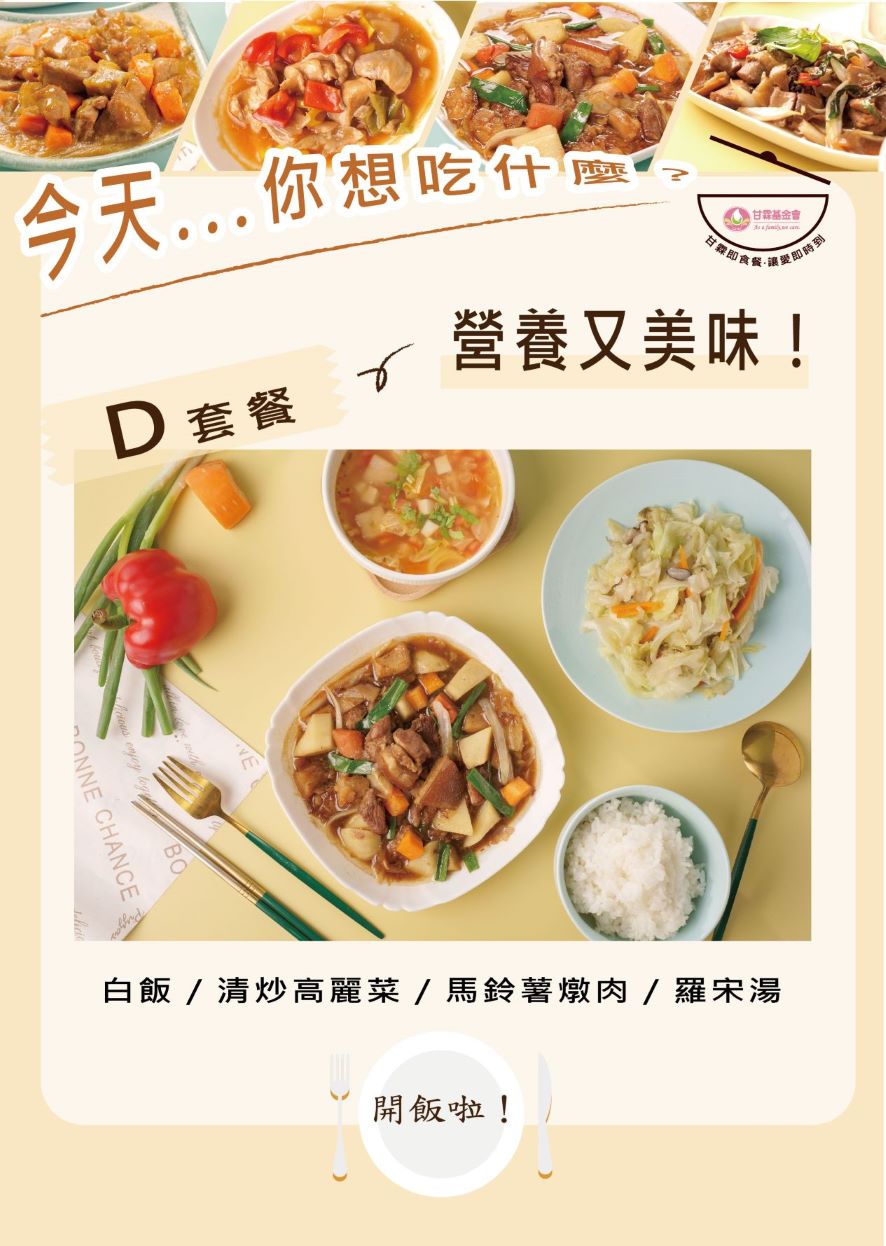 甘霖基金會【自立備餐計畫】亟需社會各界的資助與幫忙,故特將此項企劃結合義賣,推出【甘霖即食餐,讓愛即時到】預購義賣計劃,將方便又快速、僅需復熱就可上桌的「冷凍調理食品」,透過冷凍宅配,成為民眾生活上的好幫手,扣除成本後所得全數做為本會【送餐服務2.0-自立備餐計畫】經費,以使服務個案能持續獲得穩定的餐食。